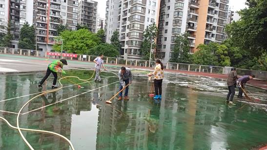 从5月8日至5月14日,清洁工们利用本职工作之余时间,完成了运动场、篮球场的清洗。由于运动场、篮球场长时间未清洗,累积了很多污泥,紧紧地粘在地面上,为清洗带来了困难。但清洁工们不畏困难,利用一个星期的时间完成了清洗。