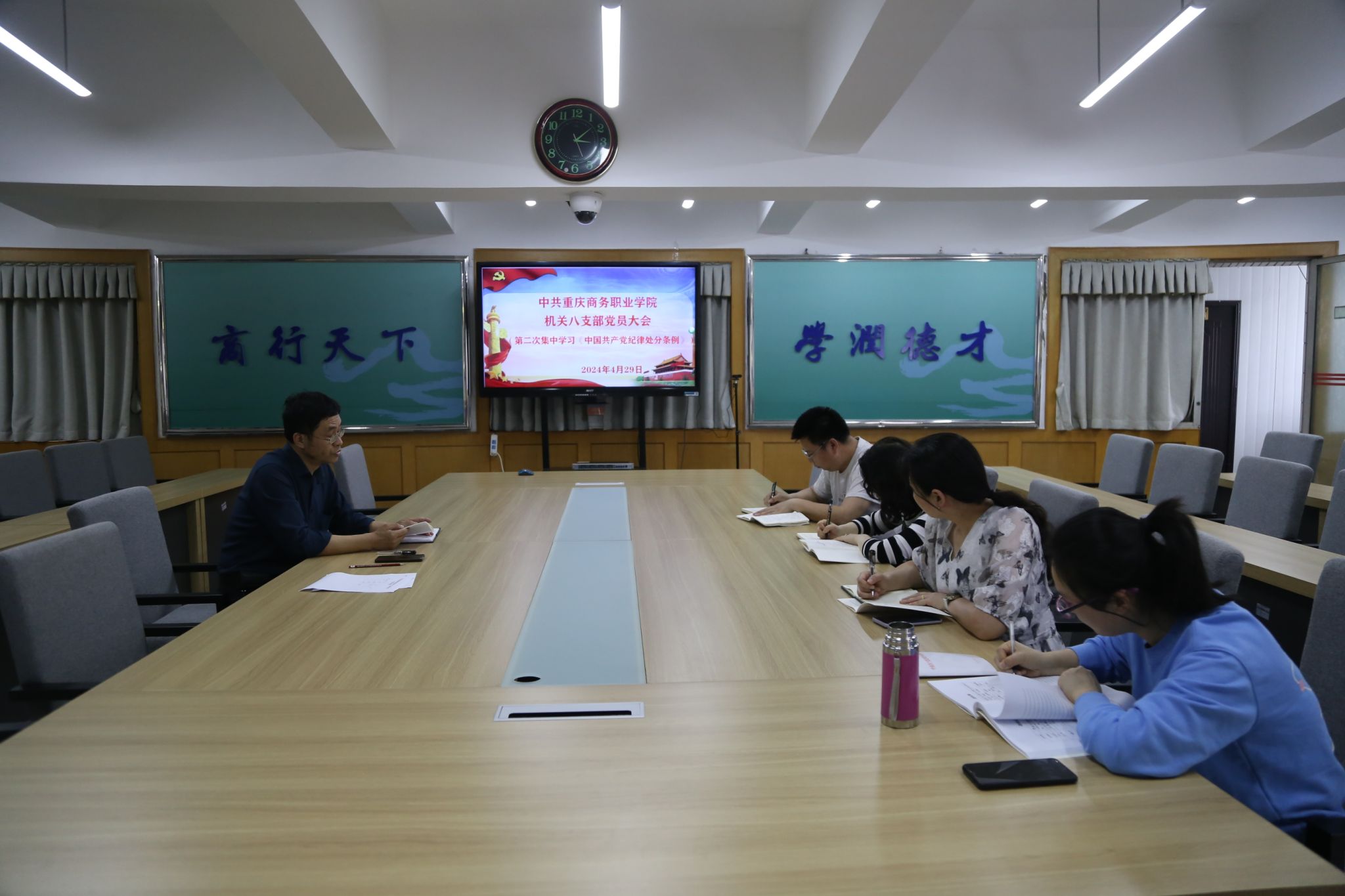 429日下午,机关八支部在南岸校区教学楼三楼会议室召开党员大会,第二次集中学习新修订的《中国共产党纪律处分条例》,支部全体党员参加会议。