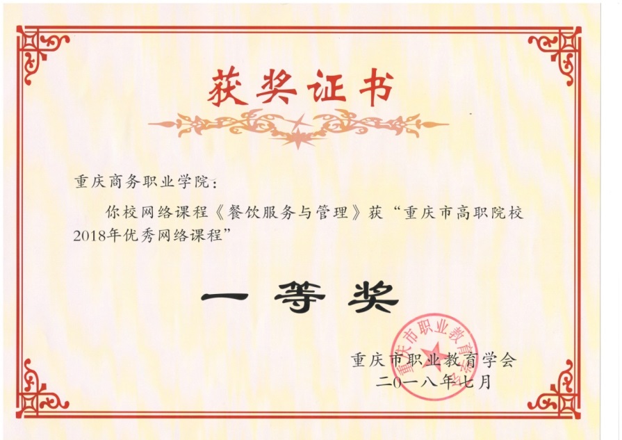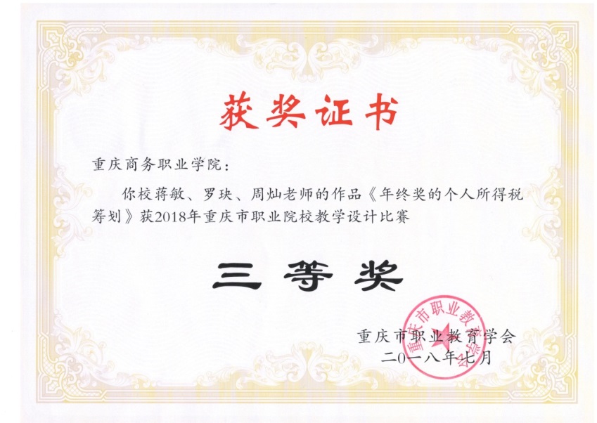 【文/图 李江伟】重庆市职业教育学会举行2018年市职业院校教学设计比赛和评选2018年市高职优秀网络课程活动。经过激烈角逐,我校餐饮旅游学院梁海兰老师负责的《餐饮服务与管理》课程荣获 “重庆市高职院校2018年优秀网络课程”一等奖;财经管理学院蒋敏、罗玦、周灿老师的作品《年终奖的个人所得税筹划》荣获2018年重庆市职业院校教学设计比赛三等奖。