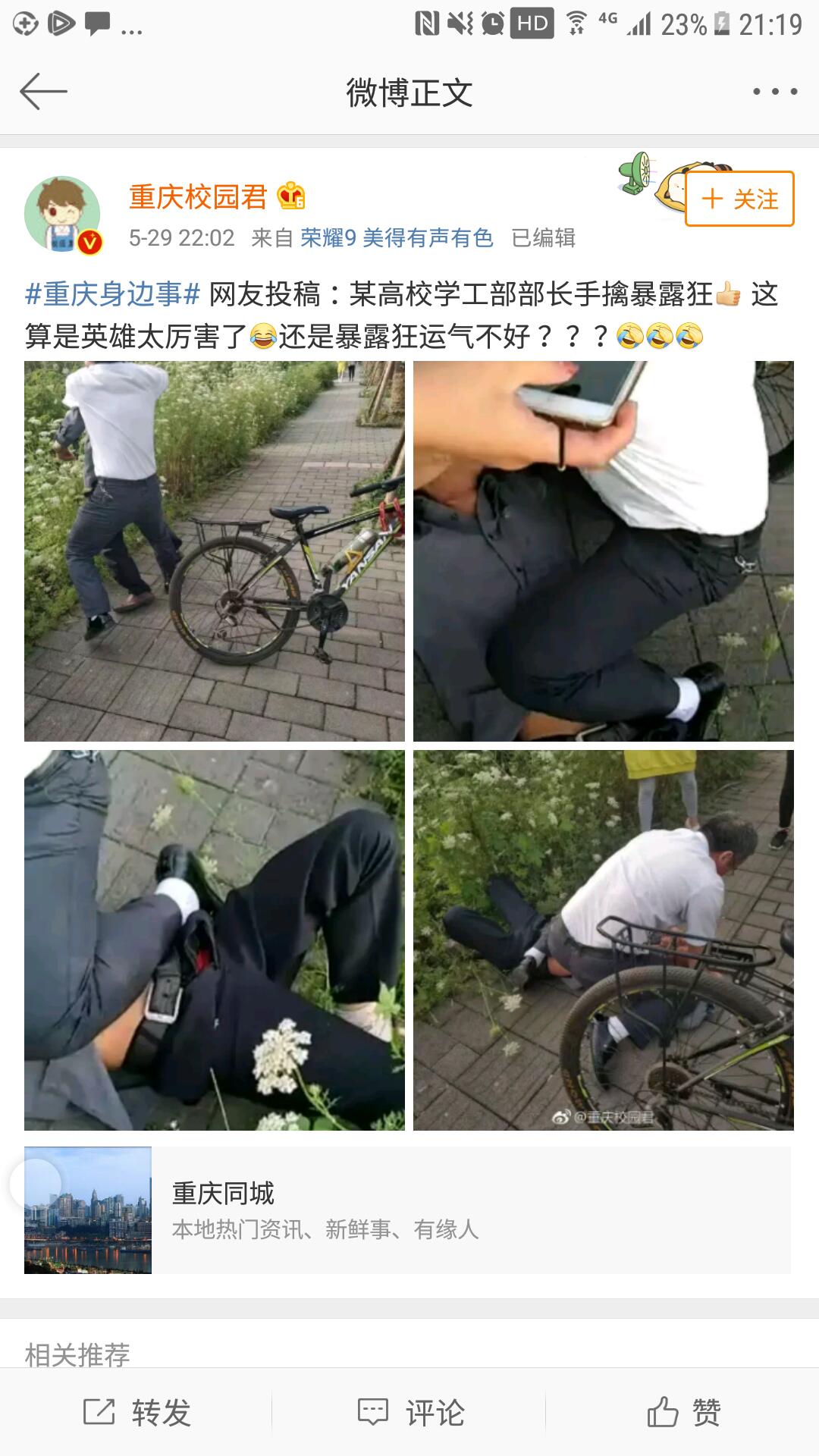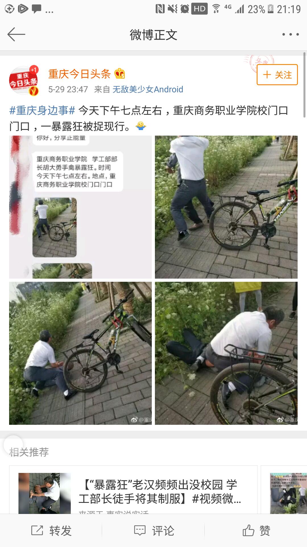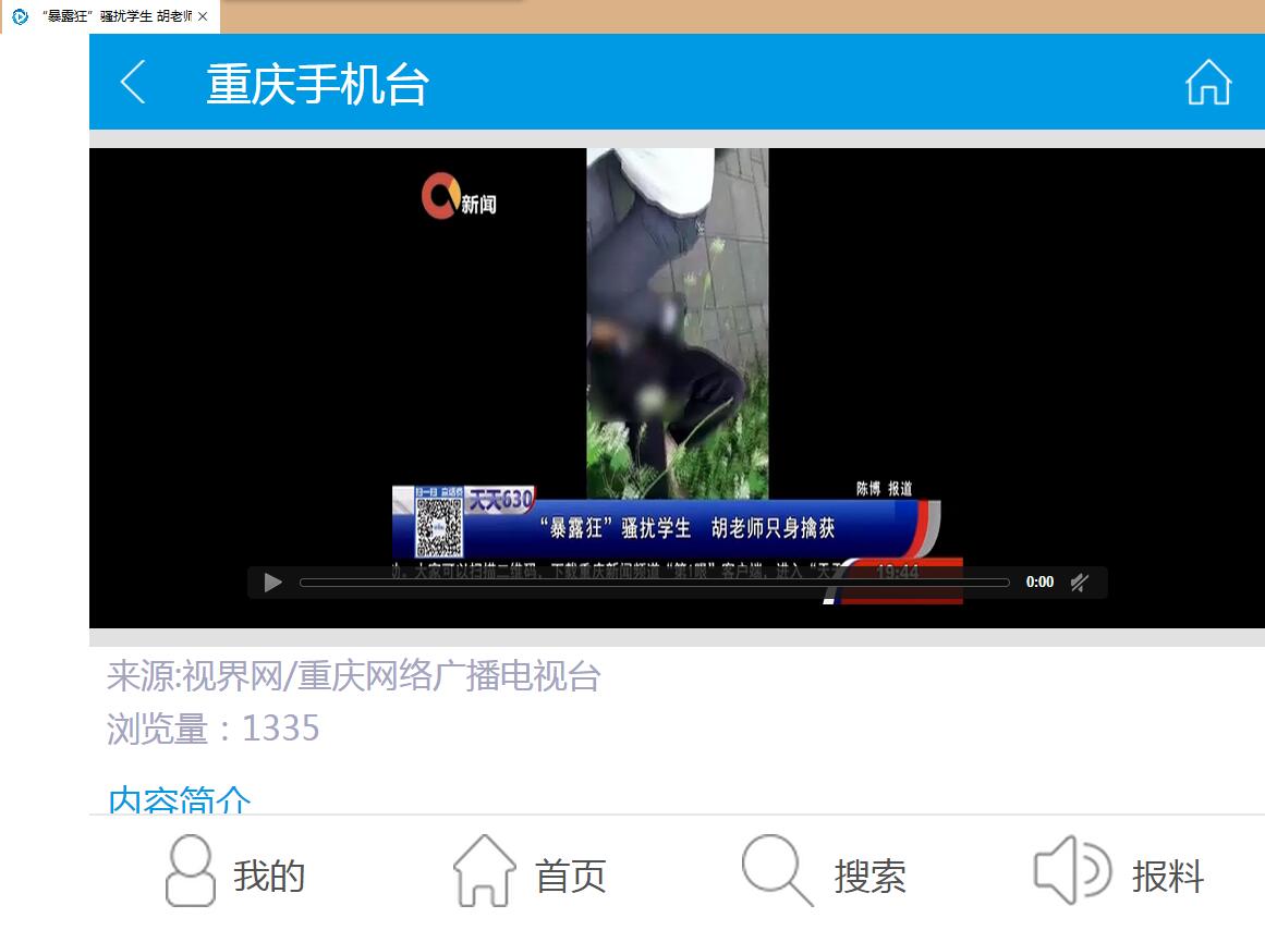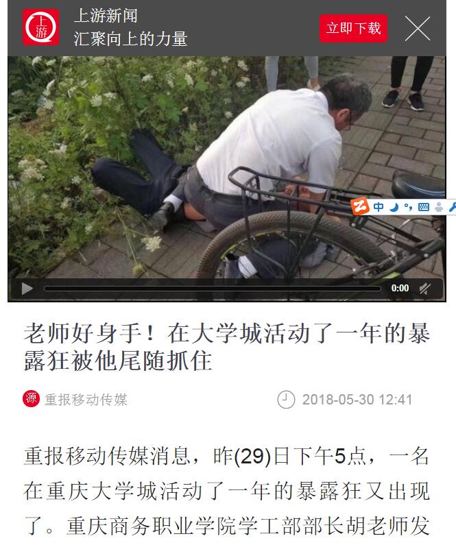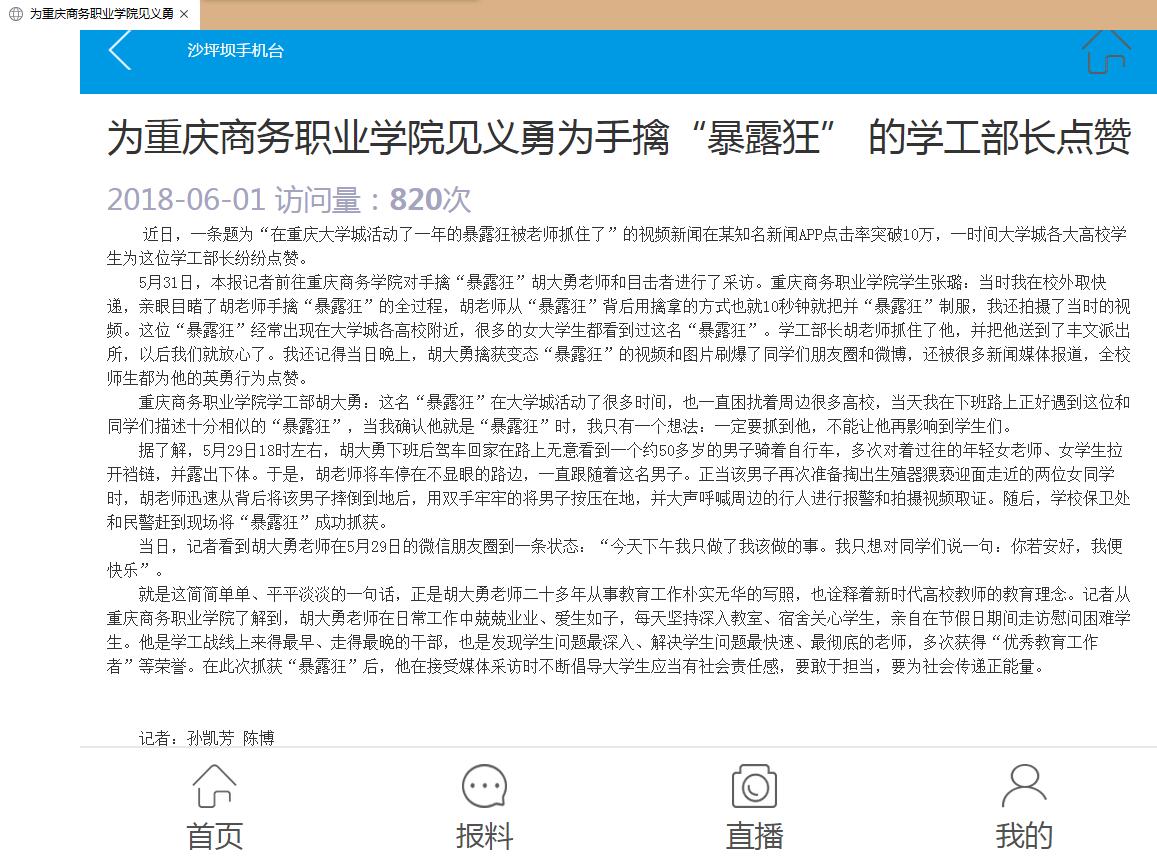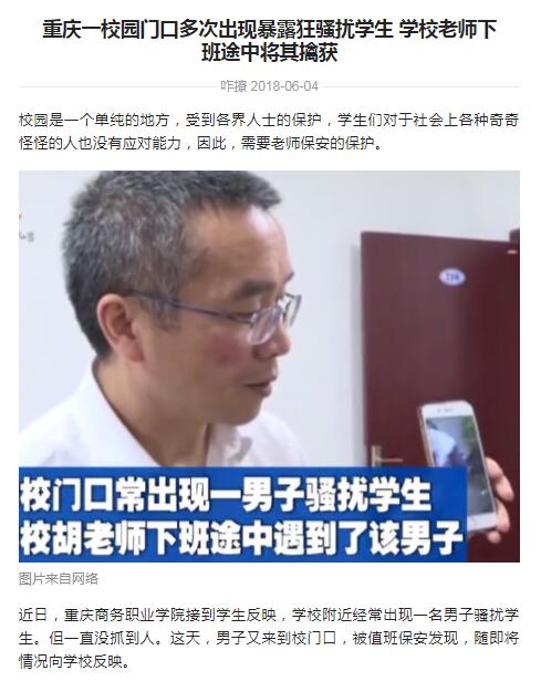 “暴露狂”老汉频频在校园附近出没,学校学工部部长胡大勇徒手将其制服,重庆电视台新闻频道、视界网、重庆手机台、重庆网络电视台、腾讯视频、时间视频、今日头条、重庆日报移动传媒、上游新闻、重庆高校、重庆校园君、重庆学生圈、沙坪坝区新闻中心等媒体对学工部部长胡大勇事迹进行了报道和转载,全国各地网民和大学城各高校师生纷纷为他的机智勇敢、见义勇为点赞,传递了正能量,对学校党政和广大教职工一直秉承的“爱生如子、大爱无疆”的理念做了最好的诠释和传播。