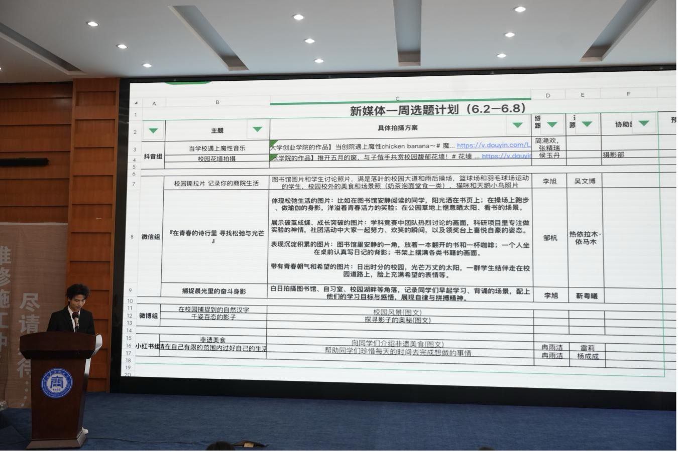 会上,融媒体新闻中心学生副主任李志超作年度工作总结汇报。他系统梳理了一年来融媒体新闻中心在新闻宣传、活动报道、平台运营等方面的工作,从校园重大活动报道策划,到官方微信、抖音平台的图文视频创作,从团队内部的创意研讨到部门管理流程优化,每一项工作成果都彰显着融媒体新闻中心的成长与蜕变。