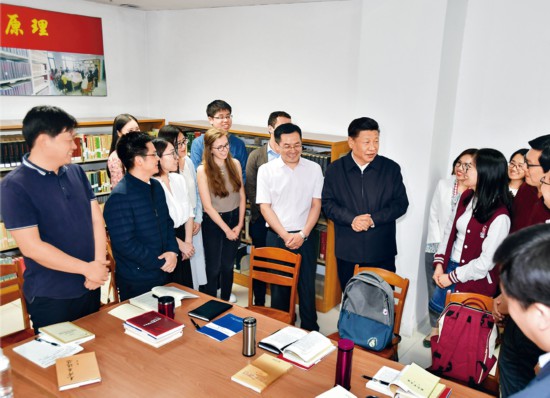2018年5月2日,中共中央总书记、国家主席、中央军委主席习近平来到北京大学考察。这是习近平在北京大学马克思主义学院,与正在就“解读新时代”进行座谈交流的中外学生亲切交谈。 新华社记者 李涛/摄