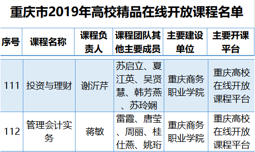 近日,重庆市教委公布2019年高校精品在线开放课程认定结果,谢沂芹老师主持的《投资与理财》、蒋敏老师主持的《管理会计实务》入选第三批市级在线开放课程。