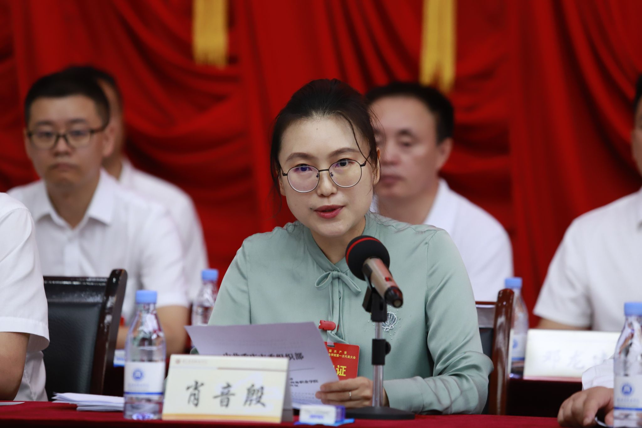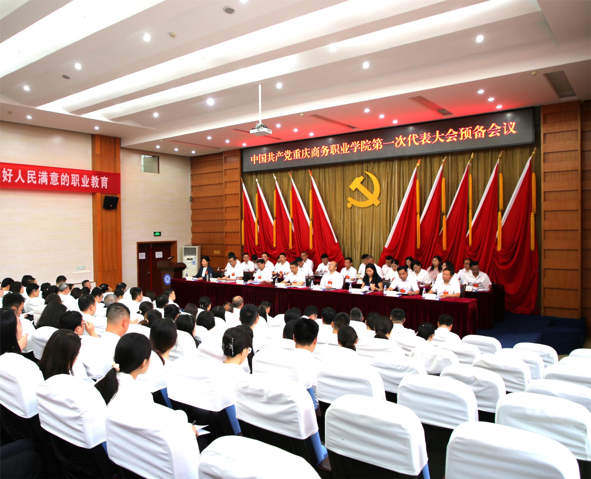 红旗殷殷,丹心澎湃。会场气氛庄严热烈,大会主席台正中悬挂中国共产党党徽,会场主席台对面悬挂“以习近平新时代中国特色社会主义思想为指导,为建设特色鲜明、西部领先、具备较强国际影响力的高水平高职院校而团结奋斗”标语。