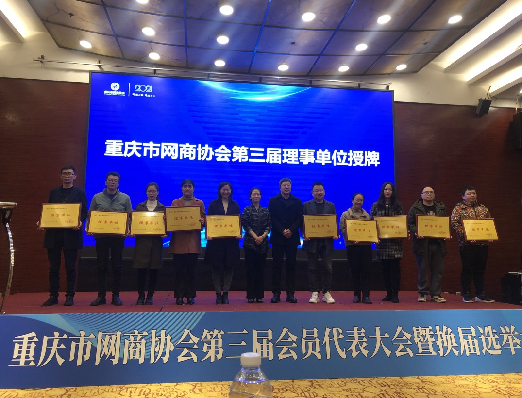 参与此次大会的推荐理事单位合计35家,会上通过现场选举的方式确定了第三届重庆网商协会理事单位名单,并进行了现场授牌。我校喜获协会理事单位称号,电子商务学院院长黄琳娜代表学校上台接受授牌。