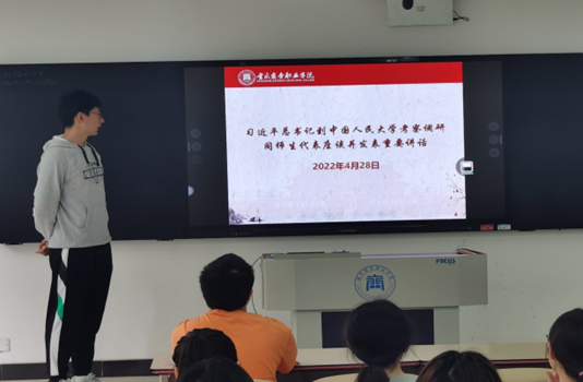 在五四青年节即将到来之际,中共中央总书记、国家主席、中央军委主席习近平在中国人民大学考察调研并作出重要讲话。为号召广大共青团干部和团员青年深入贯彻习近平总书记重要讲话精神,牢记嘱托,不负青春韶华,电子商务学院辅导员于2022年4月28日在各班级开展了“学习贯彻习近平总书记在中国人民大学考察调研讲话精神”学习教育主题班会活动。
