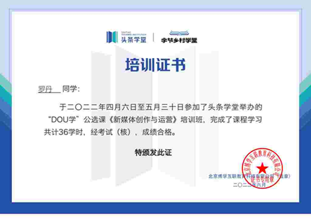 2022年4月至6月期间,由头条学堂和字节乡村学堂举办的学生公益普及类短视频运营培训“DOU学公选课2022春季班”开展了为期2个月教学,并于近日组织考核并结营,我校电子商务专业学生完成了学习并获证。