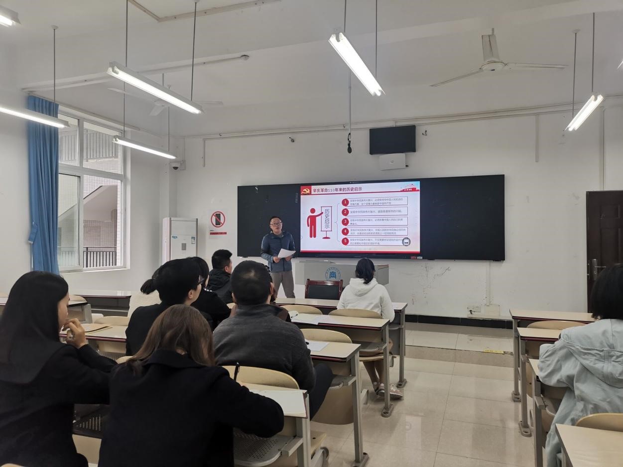 交流谈论环节,电子商务学院教师姚斯杰、田向果、王峰分别对学习内容发表了感想。姚斯杰同志说:“听了张占广老师的分享,让我对辛亥革命这段历史有了更深的了解,这段历史启示我们,要实现中华民族的伟大复兴,必须有一个坚强的领导力量,历史证明,这股力量只能是中国共产党。”田向果老师也分享了自己的感悟:“今天学习了习总书记在中央人才工作会议上的讲话,我体会到,作为高校教师,我们要把握住时代机遇,把教书育人的使命贯穿于各项工作始终,努力成长为国家需要的人才,同时也要为国家培养一批符合国家需要的技能人才,为实现中华民族伟大复兴提供人才保障。”王峰老师也向大家分享了自己的学习体会:“红色资源是不可再生的珍贵资源,我们要用心用力保护好、运用好。作为新时代的教师党员,我们要引导学生树立红色理想,用好红色资源,讲好党的故事、革命的故事、英雄的故事,用好红色资源也是我们做好思想政治教育的重要手段。”