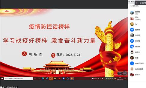 根据中共重庆商务职业学院组织人事处《关于3月主题党日活动的补充通知》文件要求,2022年3月23日下午16:00,电子商务教研室党支部书记姚斯杰同志通过腾讯会议开讲“疫情防控话榜样”专题党课,支部全体党员在线集中学习。