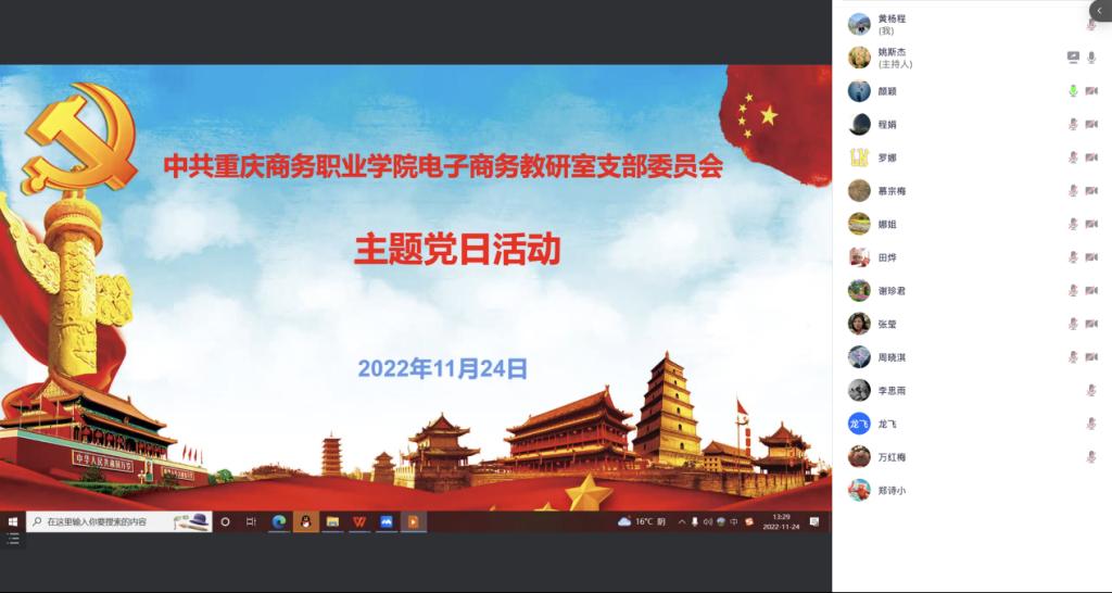 电子商务教研室党支部于2022年11月24日下午,通过腾讯会议线上开展本月主题党日活动,活动由支部书记姚斯杰同志主持,全体党员同志参加。本月党日活动主题为“学深悟透二十大踔厉奋发谱新篇”,支部所有党员同志围绕活动主题积极开展学习活动。