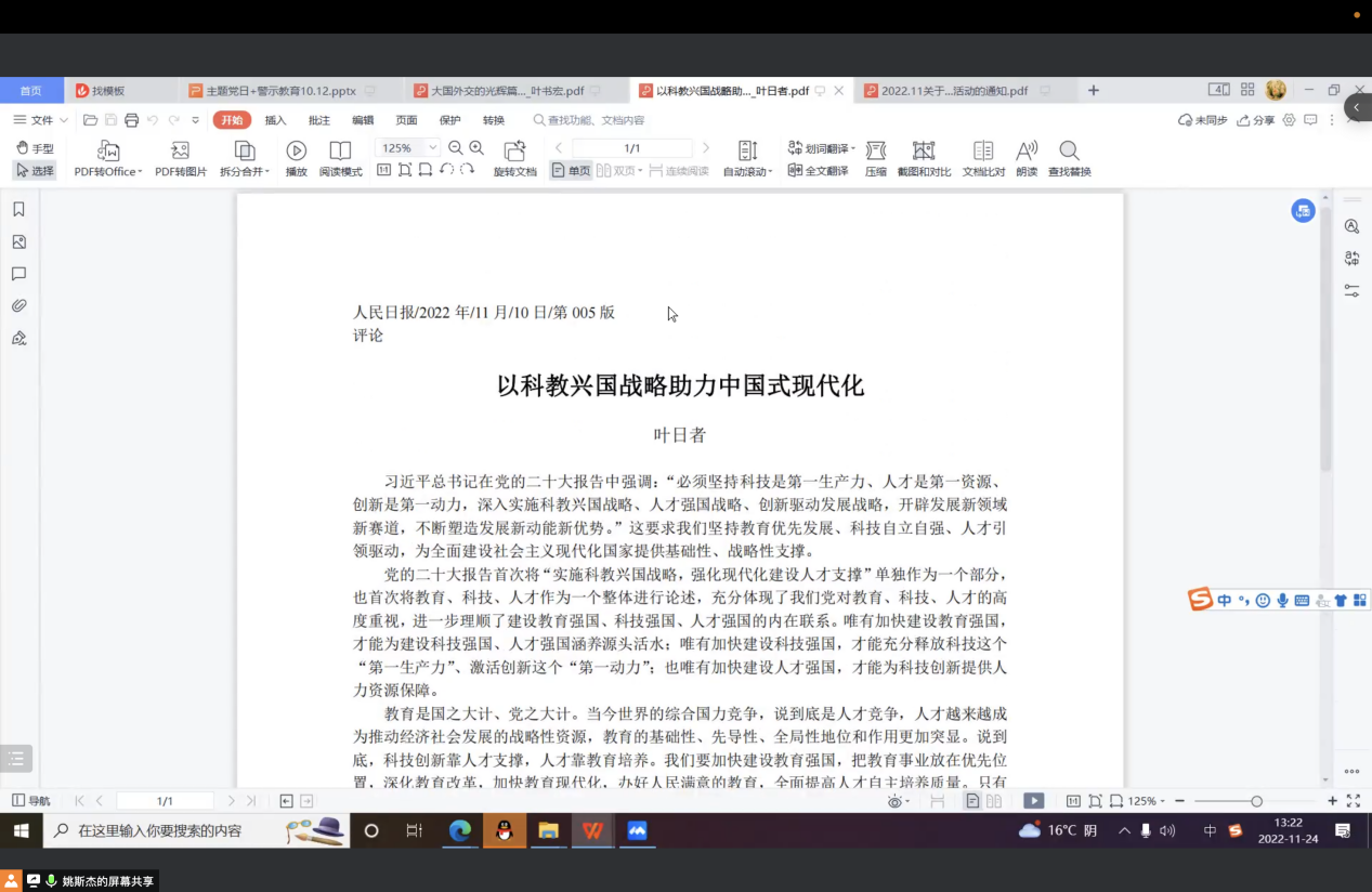 首先,姚斯杰同志带领大家观看了一个关于“中国式现代化”的短片,党的二十大会议提出,从现在起,中国共产党的中心任务就是团结带领全国各族人民全面建成社会主义现代化强国、实现第二个百年奋斗目标,以中国式现代化全面推进中华民族伟大复兴。接着对二十大报告中关于中国式现代化的内容进行了原文学习,深入了解中国当前的现代化状况。紧接着以习近平总书记在近期的外交活动中的讲话内容,引出当前我们所处的教育行业是在如何进行中国式现代化。最后,姚斯杰同志总结“当前我们正在多个领域中践行着中国式现代化”。