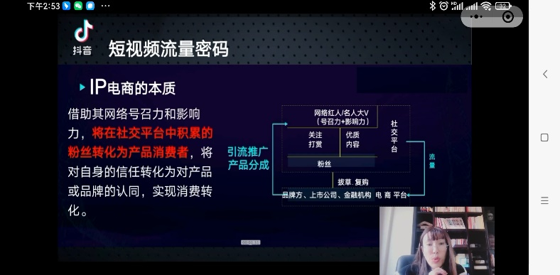 齐老师以“当下短视频创业的风口-明星直播切片”为主题,引用大量抖音案例,生动讲解了短视频的风口和机遇、抖音电商的变现逻辑、明星直播切片制作三大板块。短视频IP切片业务属于蓝海市场,利用头部主播和网红影响力,剪辑发布视频最终完成交易,享受分佣。IP切片简单易学,市场竞争相对较小,适合初入小白。