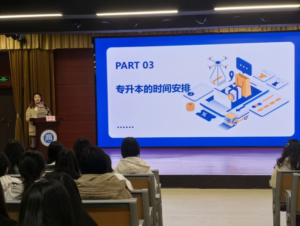 2025年3月9日,电商物流学院在学生活动中心320多功能厅举办了“学长学姐来了”系列活动之专升本经验分享会。本次活动特邀2021级现代物流管理专业两位成功专升本的学姐分享经验,吸引了众多有升本意向的同学参与,现场气氛热烈,座无虚席。