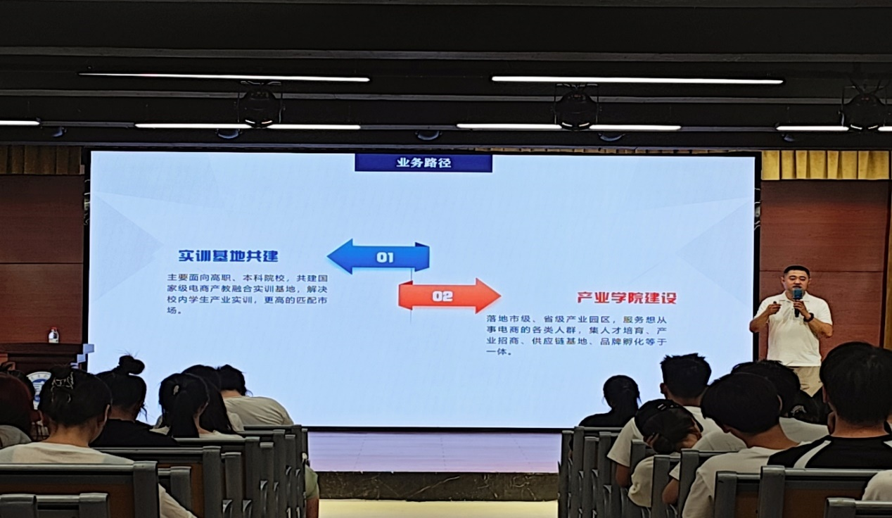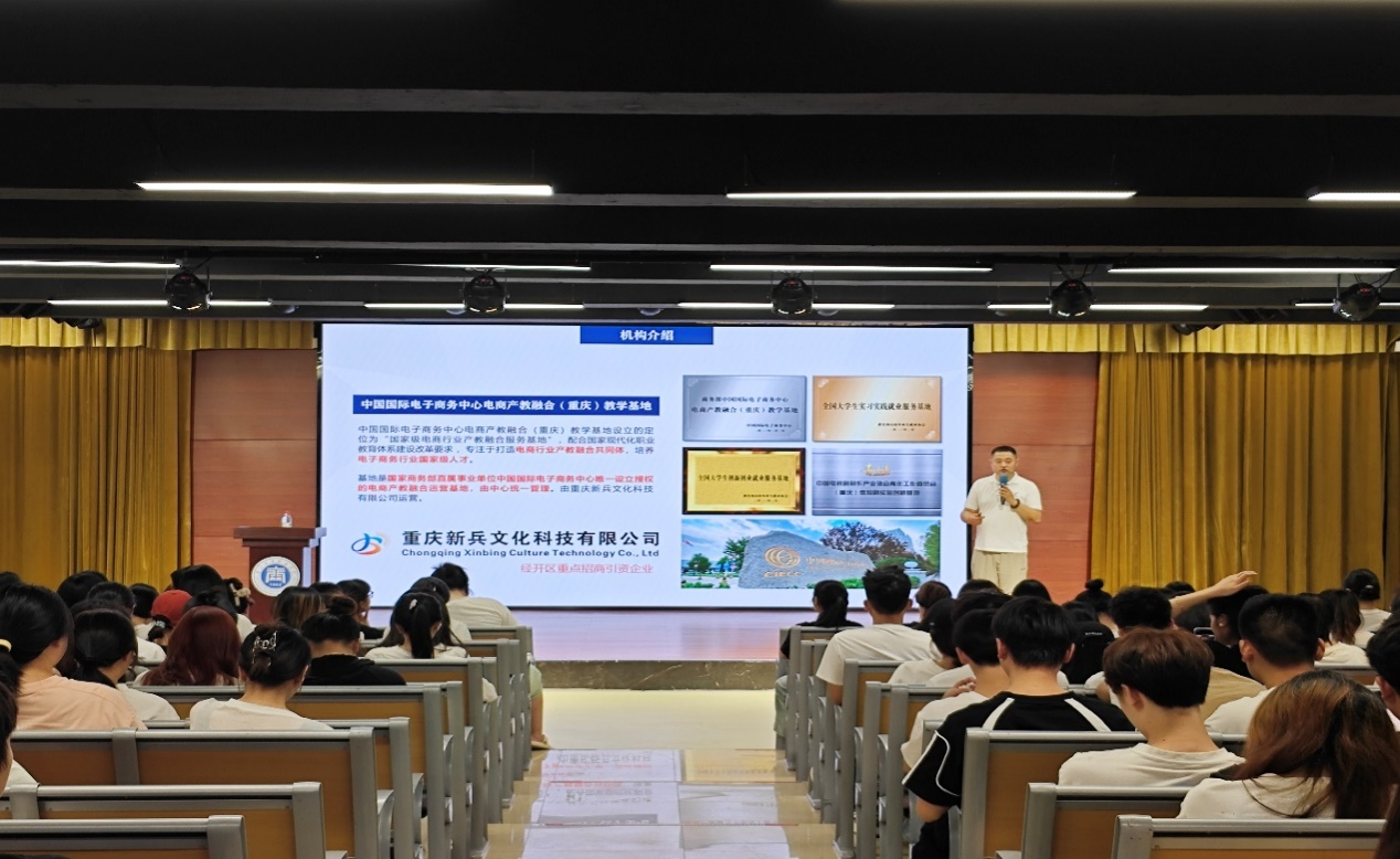 为深入学习贯彻党的二十届三中全会精神和习近平总书记关于职业教育的重要指示精神,深化校企合作,推进产教融合,切实做好电商专业现代学徒制试点工作。9月11日,中国国际电子商务中心电商产教融合(重庆)教学基地负责人徐立斌到学院开展宣讲会,电子商务专业带头人张莹,网络营销与直播电商专业带头人谢珍君以及2022级电子商务类专业学生共计320余人参加活动。