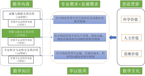 根据我校各专业人才培养方案、课程的定位、课时安排,在教学中主要讲授一元函数的微积分,主要包括函数与极限及其应用、导数与微分及其应用、不定积分与定积分及应用等三模块。以学生为中心,基于学生终生发展需求,将教学内容进行优化或重构,将课程思政融入、课程专业融通、理论实践融合,打造“一中心三融合”教学模式。不仅使课程和专业之间实现互融互通,提升学生利用数学知识解决实际问题的能力,使学生真正做到知行合一,而且发挥高职数学“立德树人”作用。