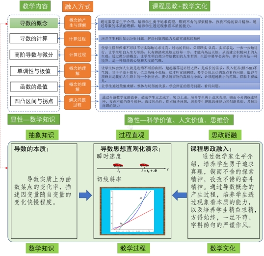 图3 基于数学文化教学内容中融入“课程思政”(以导数部分为例)