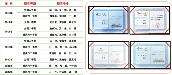 以数学建模竞赛为平台,通过组织、培训学生参与数学建模竞赛,使学生学以致用的能力得到全面提升,近年来获得全国大学生数学建模竞赛全国奖5次,重庆市奖6次,培育数学建模、数据分析技术技能人才30余人,做到“一次参赛,终生受益”,职业核心竞争力得到有效提高。