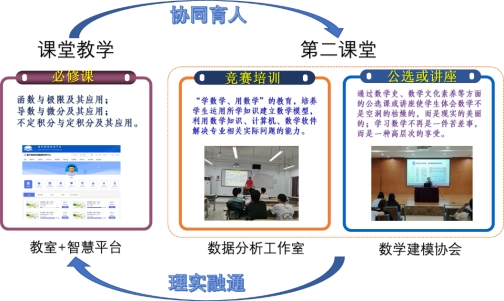 实施“课堂教学+工作室+学生社团”的课内课外协同育人。一是课程与专业融合的必修课堂筑牢基础,让学生初步掌握如何利用数学知识解决专业问题的能力;二是在课堂教学的基础上,以数学建模竞赛为载体,以数据分析大师工作室为平台,定期积极开展学生“学数学、用数学”的教育。通过数学建模的参与让学生实践利用数学知识解决实际问题,做到“理实融通”;三是数学建模协会积极组织开展数学建模、数学文化素养方面的相关讲座或活动,让学生感受到数学的价值,提升学生综合素质,扩大教学成果的受益面。