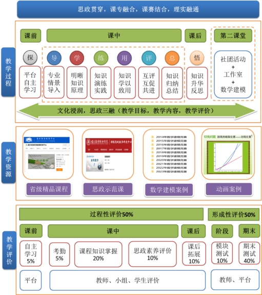 教学团队依托重庆市在线精品课程《经济数学》、校级《高等数学》课程思政示范课建立“数字化教学资源库”,打造涵盖在线课程、电子教案、数学建模案例库、专业案例库等“思政贯彻、课专融合、理实融通”的多维立体化教学资源平台。