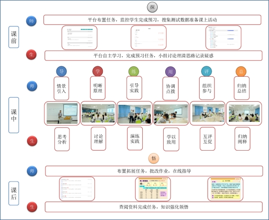 在课前、课中、课后三个环节开展“探、导、学、练、展、评、总、悟”八步教学,具体实施过程如下: