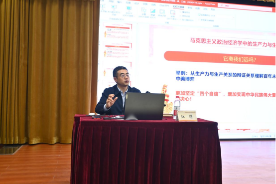 首先,江涛对青马学员提出“马克思主义它离我们远吗?”他指出马克思主义的立场、观点和方法指导着我们日常学习、生活和今后工作,我们要善于运用马克思主义的方法论和世界观。接着,他从马克思主义的立场、观点和方法,马克思主义哲学中的三大规律、五大范畴,马克思主义政治经济学中的生产力和生产关系,中国式现代化开辟了科学社会主义发展新境界四个方面进行详细讲授。最后,江涛提出,青马班的学员应以更高的目标和追求严格要求自己,并激励学员们继续拼搏向上、奋斗进取,不断实现自我提升、自我超越,在强国建设、民族复兴新征程上展现青春的锐气、朝气。