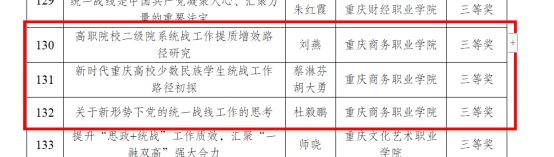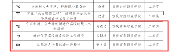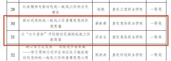 学校党委高度重视统战工作,不断加强对统战工作的组织领导,健全统战工作领导体制和工作机制,把党中央、市委的各项决策部署落到实处,推动新时代学校统一战线工作高质量发展,为学校“双高”建设凝聚强大合力。本次征文活动由学校党委统战部牵头开展,各二级党组织积极动员党内外教师参与,经校内外专家评审,最终遴选出多篇优秀论文参加市委教育工委统一战线征文活动评选。