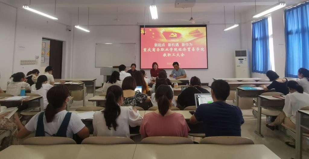 秋风送爽,丹桂飘香。9月3日下午, 经济贸易学院在1322教室召开教职工大会。学院党政领导班子、全体教职工共43人参加会议。学院党总支书记、院长李春红主持会议。