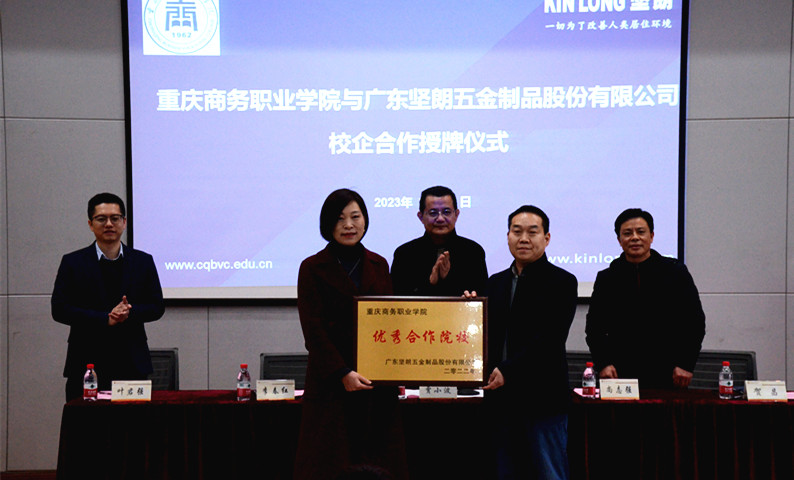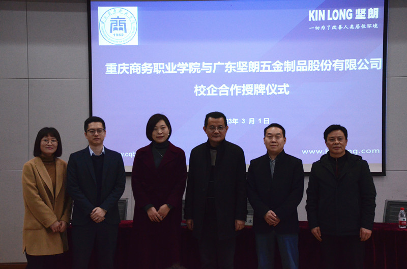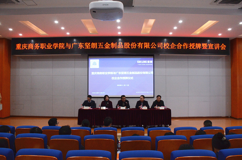 【文/贺睿 图/党委宣传部 】为深化校企合作,实施产教融合,提升人才培养质量,助力学生成长成才。3月1日下午,重庆商务职业学院经济贸易学院与广东坚朗五金制品股份有限公司(以下简称坚朗)校企合作授牌暨订单班宣讲会在第二学术报告厅举行。学校副院长贾小波、坚朗重庆分公司总经理尚志强及其团队、经济贸易学院党政领导班子及师生代表出席仪式。