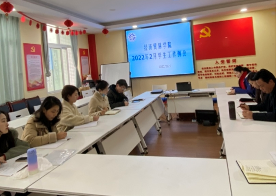 【文/图 蒋杨】2022年2月25日上午9:30,经济贸易学院在1301会议室召开了新学期学生工作例会,经济贸易学院党总支书记、院长李春红、党总支副书记贺昌、学团办副主任王瑶、全体辅导员、学工干事蒋杨参会,会议由贺昌主持。