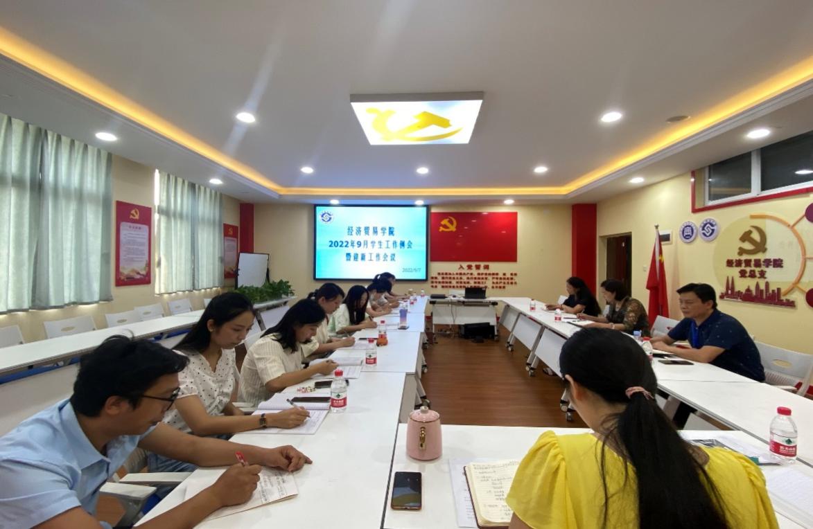 【文/图 蒋杨】2022年9月7日下午,经济贸易学院在1301会议室召开9月学生工作例会暨迎新工作会议,学院党总支书记、院长李春红、党总支副书记贺昌、副院长王芳、学团办副主任王瑶、全体辅导员、行政人员参会。