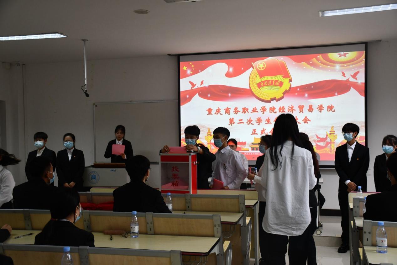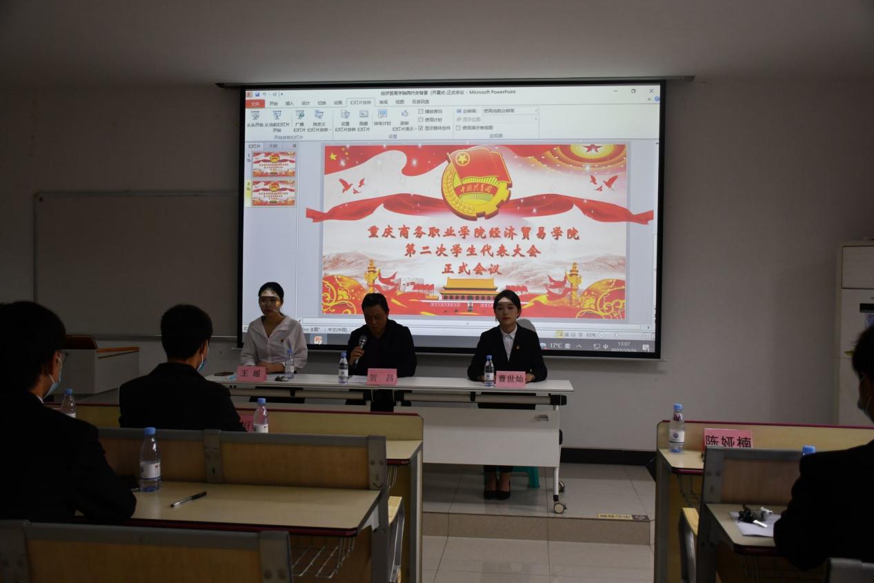正式会议上,蔡恒巍同学向大会作了《学生会工作报告》。会议审议通过了此份报告、选举办法、学代会委员候选人和监票人、计票人名单。最后,大会选举产生了经济贸易学院第二届学生委员会。