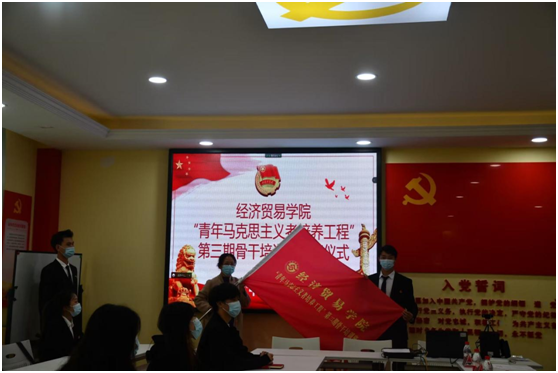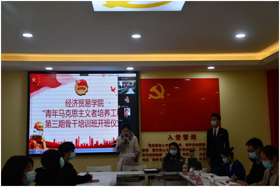 【文/古万权 图/张书菲】2022年11月21日,经济贸易学院在1301党建工作室和腾讯会议上举行了“青年马克思主义者培养工程”第三期骨干培训班开班仪式,学院党总支副书记贺昌、副院长王芳、教务办主任刘豪、学团办副主任王瑶、教师代表及全体学员参会。