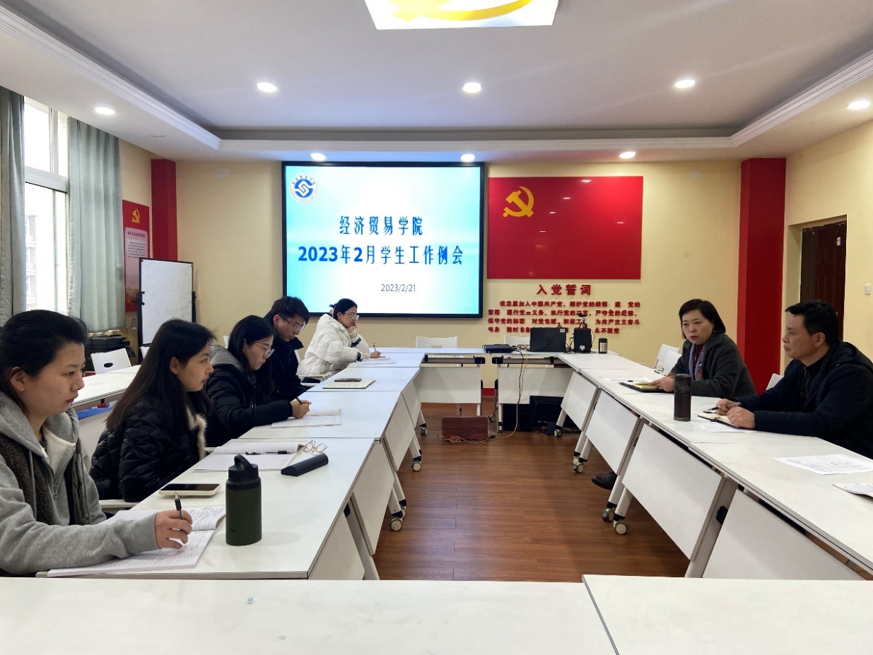 【文/图 蒋杨】2023年2月21日下午,经济贸易学院在1301会议室召开2月学生工作例会,学院党总支书记、院长李春红,党总支副书记贺昌及全体学工队伍参加会议。会议由贺昌主持。