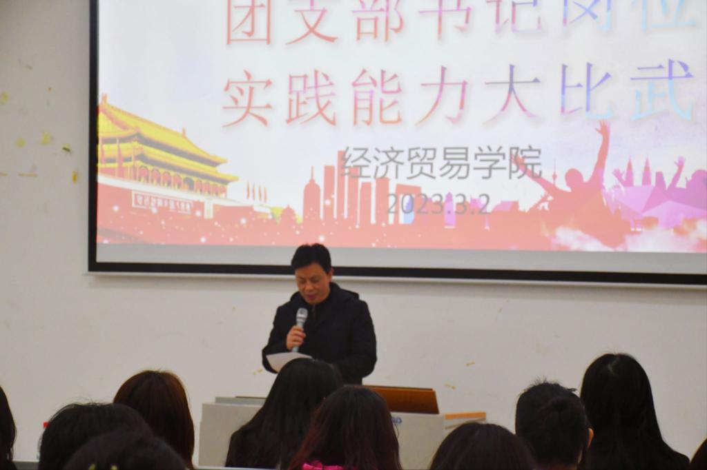 【文/图 蒲骊衡】为深入学习贯彻党的二十大精神,提升团支部书记的素质能力,加强团支部思想政治引领工作,为学生干部搭建一个学习交流平台。2023年3月2日下午,经济贸易学院在1318教室开展了“学习二十大,奋进新征程”为主题的团支部书记岗位实践能力大比武活动。学院党总支副书记贺昌、学工干事蒋杨、辅导员蒲骊衡以及学生代表团总支副书记张钞菱和学生会主席团成员欧阳左钱担任评委。