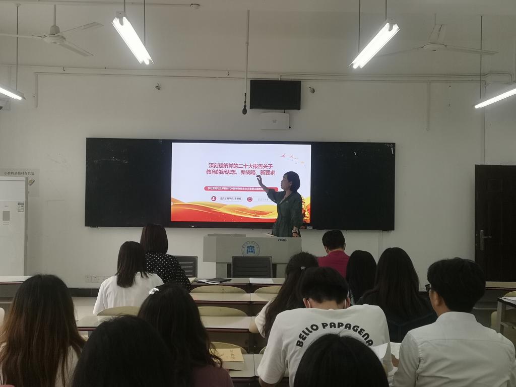 李春红结合自身学习体会,紧贴学院发展实际,从党的二十大报告中关于加快建设教育强国、加快建设高质量教育体系、办好人民满意的教育、全面贯彻党的教育方针,落实立德树人根本任务等方面进行了深刻阐释。她指出,党的二十大为新时代新征程党和国家事业发展指明了前进方向、确立了行动指南,党的二十大报告将教育、科技、人才放在战略任务中进行统筹部署,体现了党对社会主义现代化建设规律的新突破、对教育发展战略的新突破、对教育、科技、人才事业发展理念的新突破。