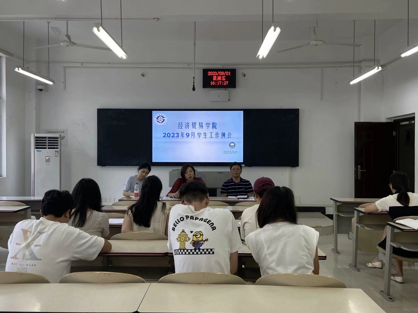 【文/图 蒋杨】2023年9月1日下午,经济贸易学院在1308召开9月学生工作例会,经济贸易学院党总支书记、院长李春红、党总支副书记贺昌、学团办副主任王瑶、学工干事蒋杨、全体辅导员参会。会议由贺昌主持。