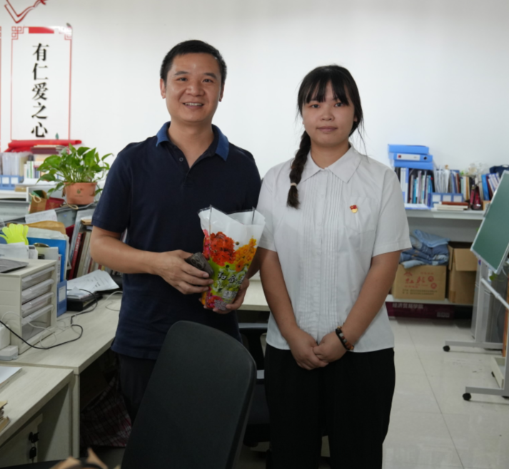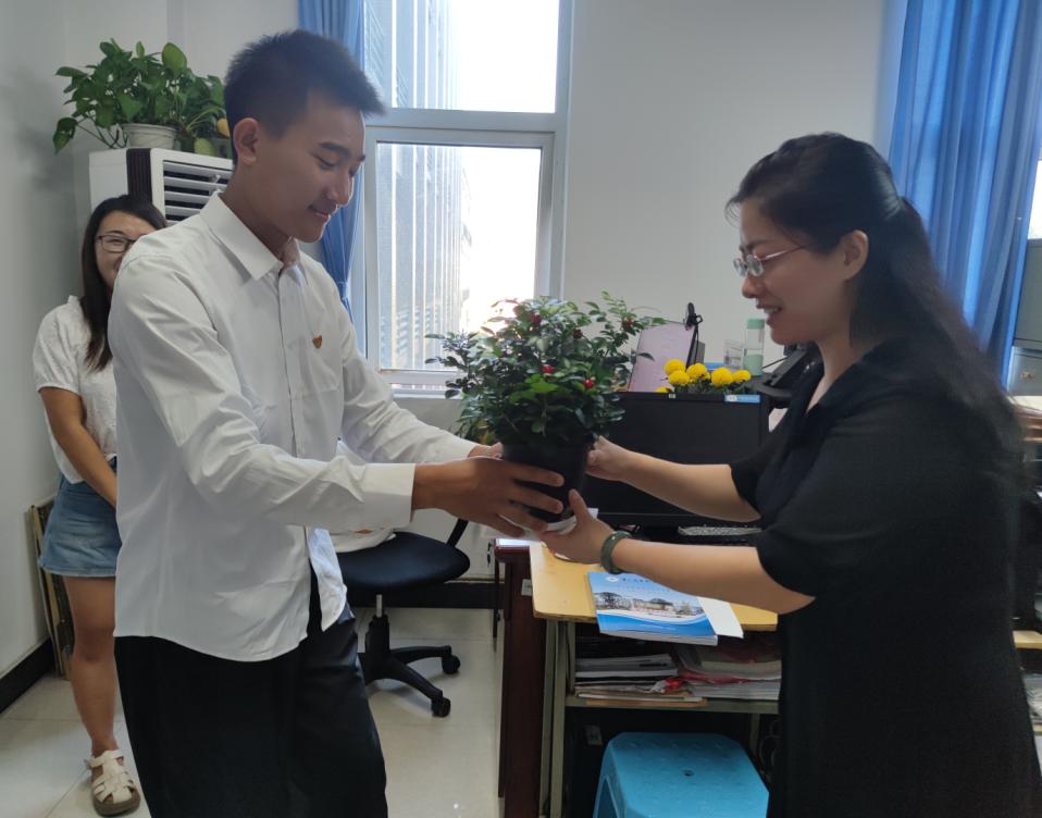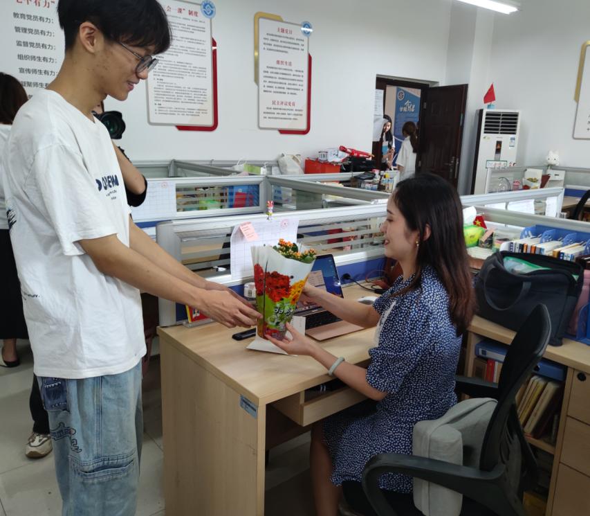 学院团总支、学生会组织学院所有班级在9月8日课前向任课教师行拜师礼,向老师道上一声“老师,您辛苦了!” 庄重的仪式感培养学生们尊重师长的美德,增强教师责任感和使命感。学生们向学院所有教师送上手写的贺卡和绿色植物,表达对老师悉心教育的感谢,传递对老师的美好祝福;团总支学生干部代表精心准备绿色植物,并送到每一位老师手中。