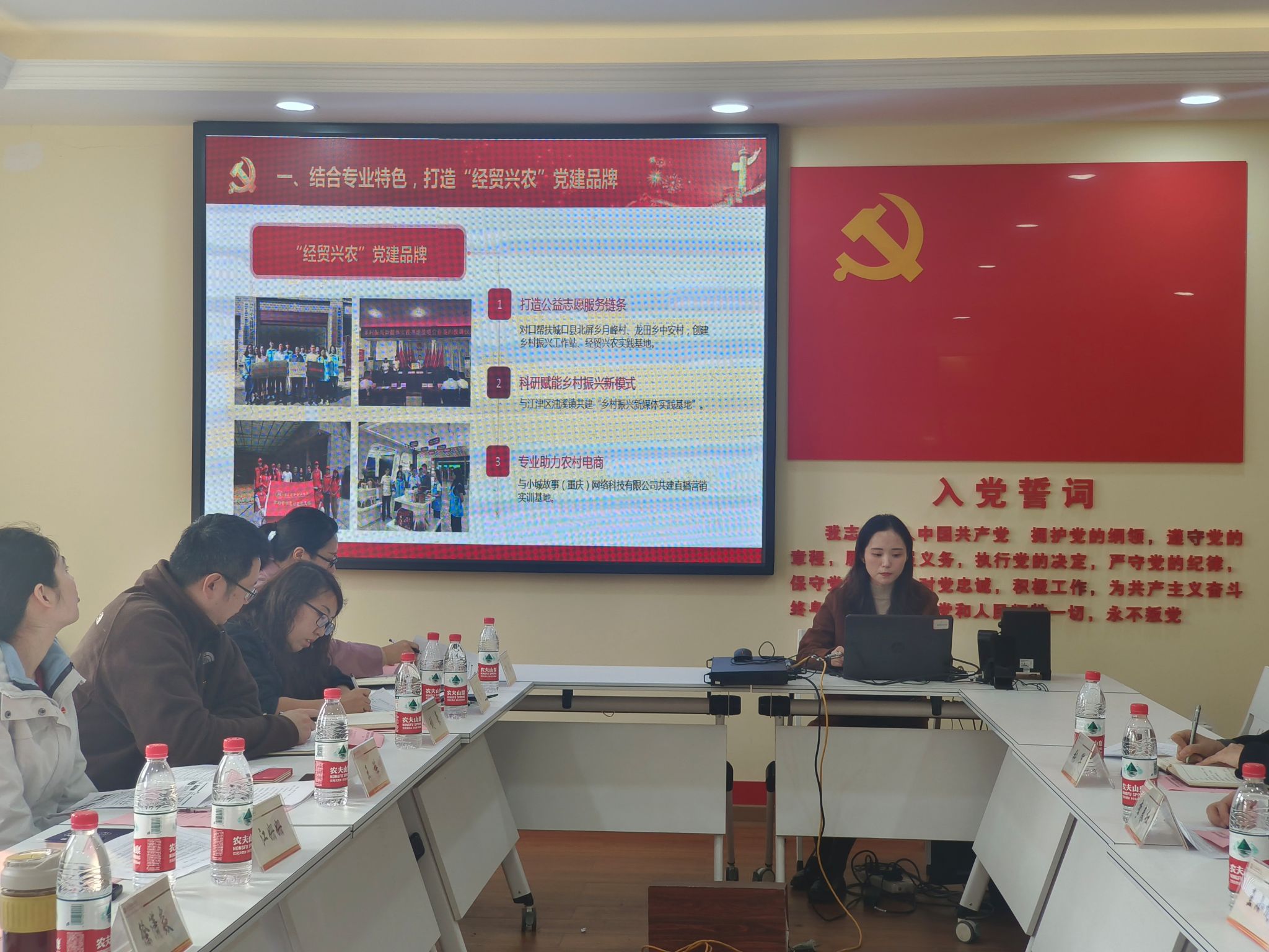 会上,学院专职组织员高红对标《中共重庆市委教育工作委员会关于开展第二批新时代高校党建示范创建和质量创优工作的通知》和申报书,对建设进展情况进行了汇报。市场营销教研室党支部书记江姗姗对“全国党建工作样板支部”建设情况进行了详细汇报;学生党支部书记王瑶、商务管理教研室党支部书记周双燕对各自支部校级党建“双创”工作进行了汇报。与会人员就开展党建“双创”工作进行了讨论交流,明确了创建标杆院系的整体思路、当前的完成情况、下一步的建设计划,以及存在的困难和问题等,对照《任务分解书》部署了近期工作。