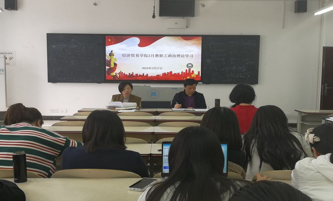 【文/图 贺睿】3月27日下午,经济贸易学院在1308教室组织开展全体教职工政治理论学习。学习由学院党总支书记、院长李春红主持。