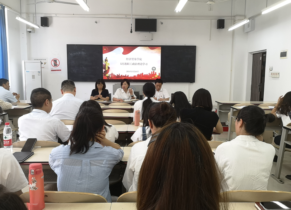 【文/图 贺睿】5月15日下午,经济贸易学院在1308教室组织开展全体教职工政治理论学习。学习由学院党总支书记、院长李春红主持。