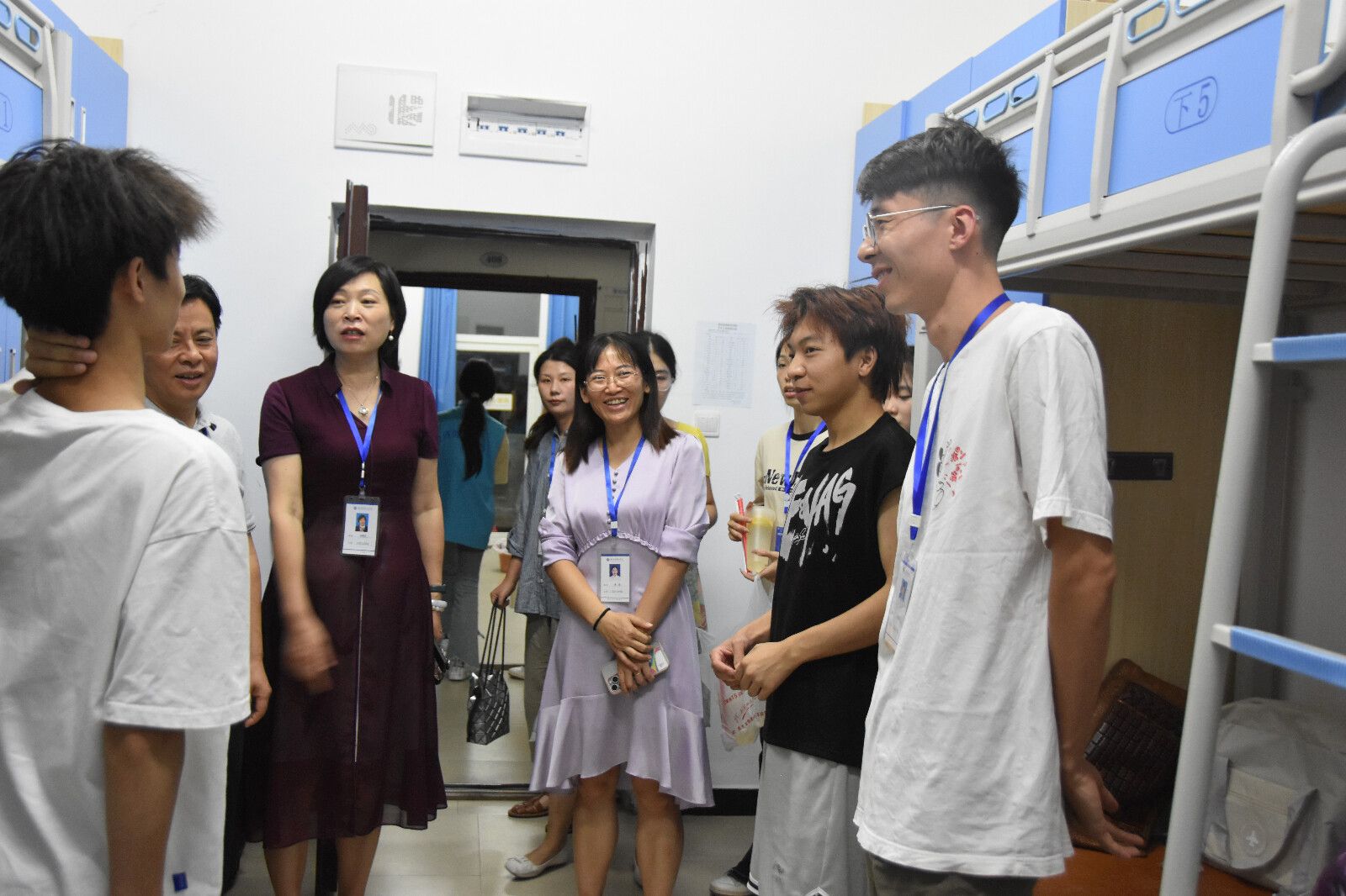 13日晚上,学院党政班子深入新生寝室,关心慰问新生,为他们送去消暑饮品。学院党总支书记、院长李春红嘱咐同学们尽快转变角色,熟悉新的环境,养成良好的学习习惯、生活习惯,大学期间多读书、读好书,不断提升、充实自己;学院党总支副书记贺昌、副院长王芳耐心解答了同学们关于学习和校园生活的疑问,鼓励他们共同营造一个和谐有序的宿舍环境。 夏日送清凉,关爱沁人心。接到学院领导和老师们送来的消暑饮品,新生感受到了来自学院的关怀,表示在未来的学习和生活中将严格要求自己,练就过硬本领,实现自身理想。