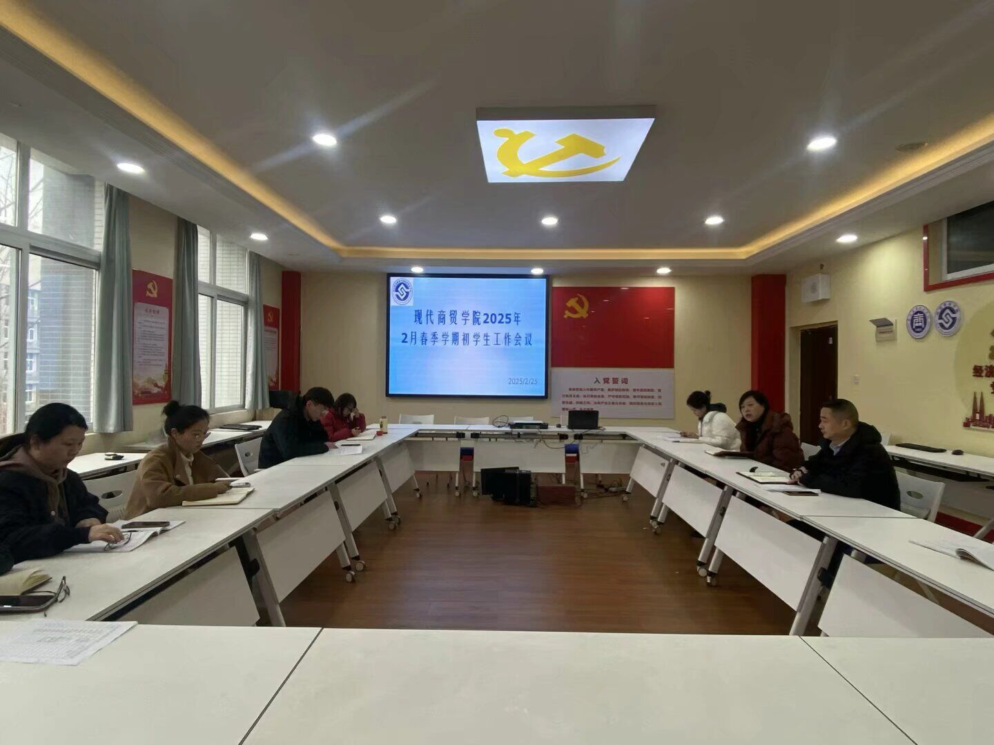 【文/图 蒋杨】2025年2月25日下午,现代商贸学院在1301会议室春季学期初学生工作例会,现代商贸学院党总支书记、院长李春红,党总支副书记徐鸥,全体学工人员参会。
