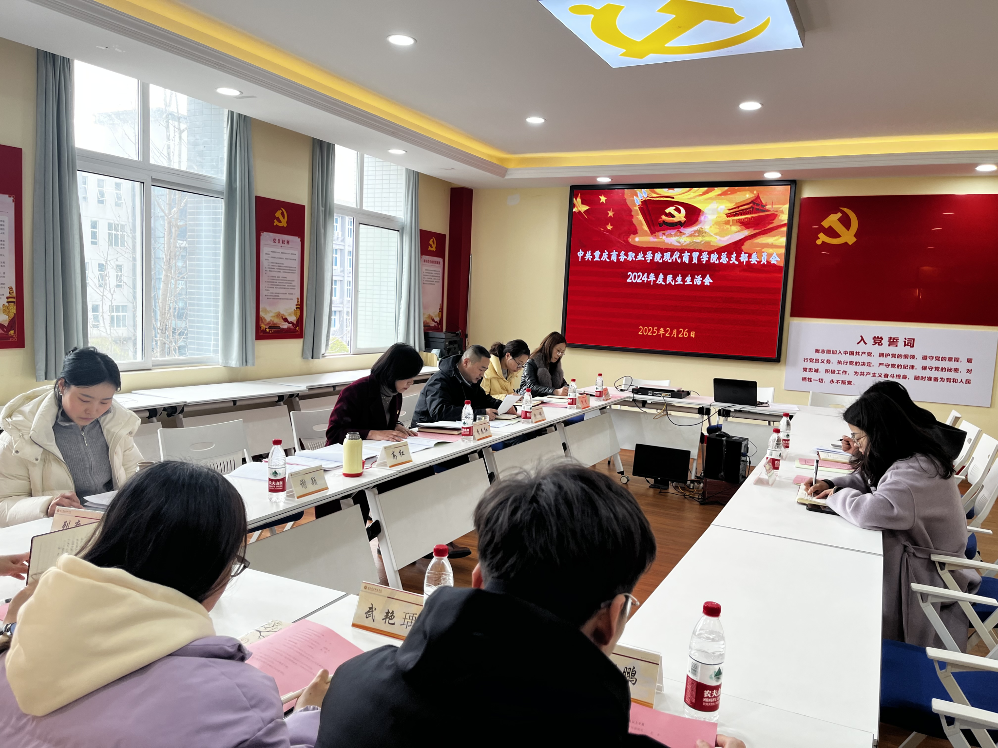 【文/图 高红】为深入学习贯彻习近平新时代中国特色社会主义思想,巩固深化党纪学习教育成果,提升学院党建水平,推动学校高质量发展,2月26日下午,现代商贸学院党总支在1301召开2024年度民主生活会。会议由学院总支书记李春红主持,全体班子成员参加会议。学校党委组织部副部长陶娟、教务处副科长张秀琼到会指导。