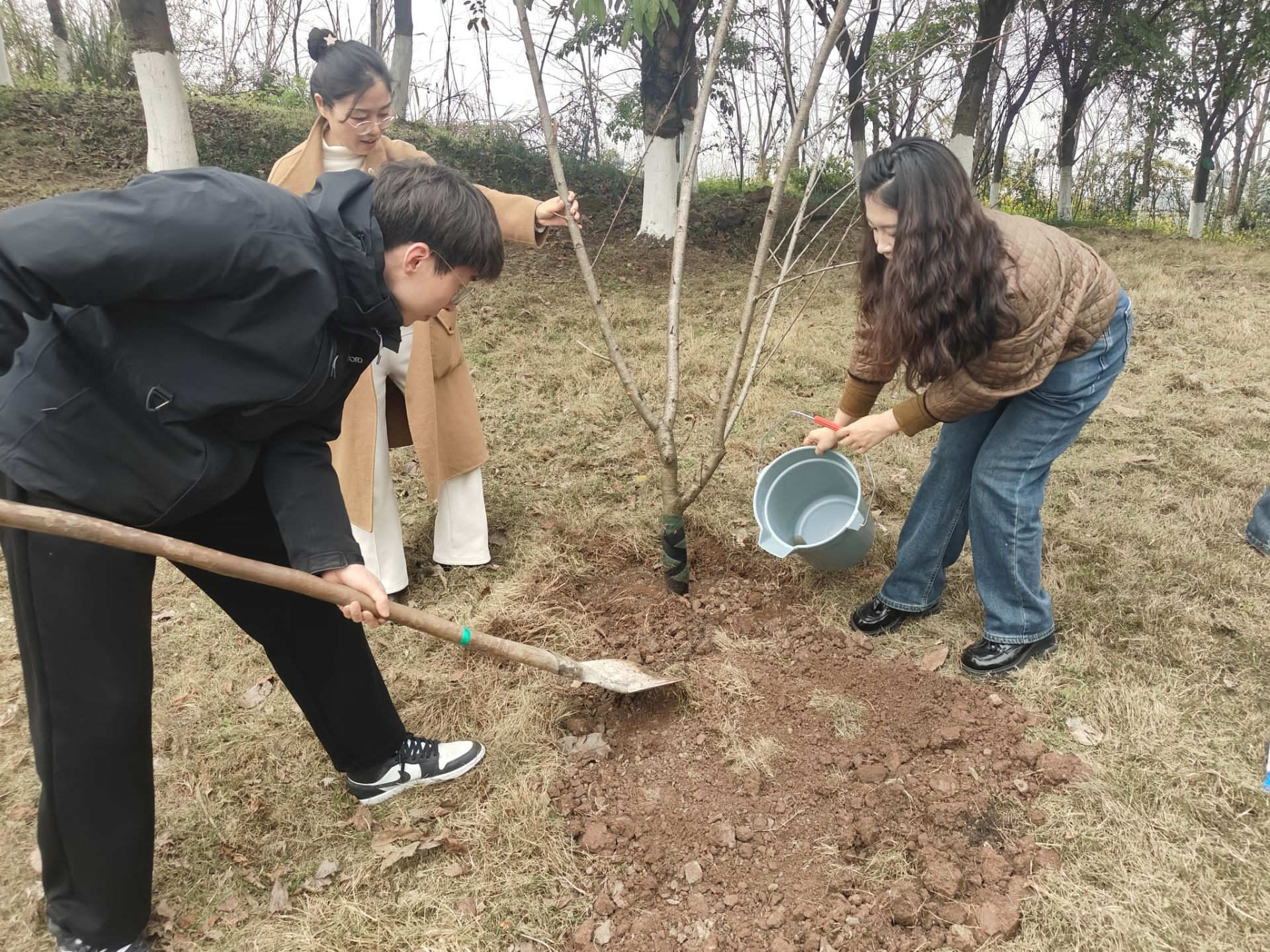 此次植树活动既是生态文明的实践课,更是劳动育人的大课堂。在专业园艺师指导下,师生们结成劳动小组,划分责任片区。教师们率先垂范,挥锹培土间传授种植技巧;学生团队通力协作,运苗、扶正、填土、浇水各环节衔接有序。