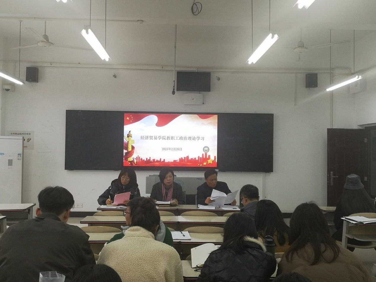 【文/图 贺睿】2月28日下午,经济贸易学院在1308教室组织开展全体教职工政治理论学习。学习由学院党总支书记、院长李春红主持。