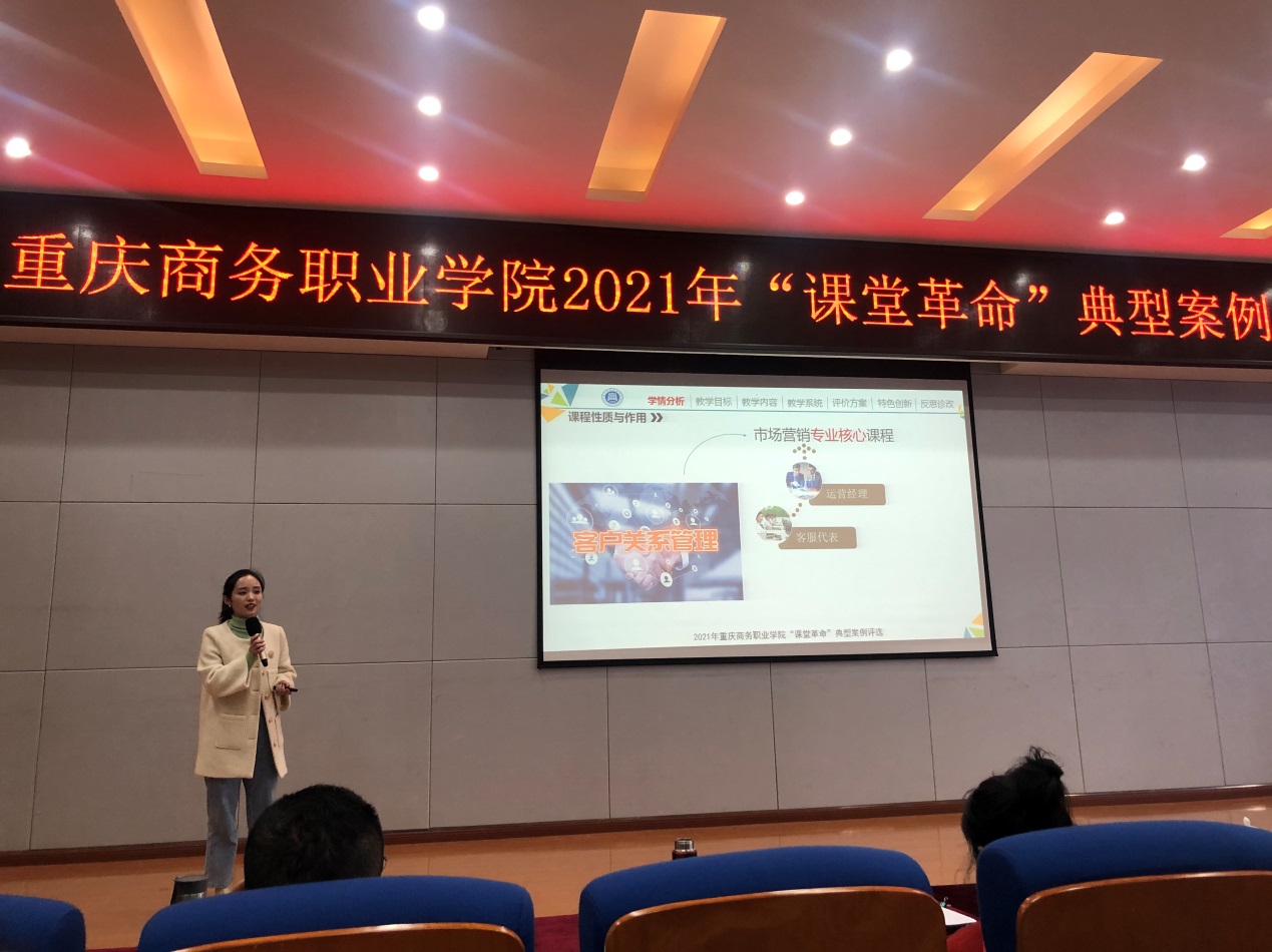 2021年12月13日,重庆商务职业学院2021年“课堂革命”典型案例展示在第二学术报告厅顺利举行,本次活动有来自全校10个二级学院共计30名教师参加。经过教学设计初评、随堂听课、现场展示3个环节的激烈角逐,我院市场营销教研室专任教师江姗姗老师在本次活动中喜获二等奖。