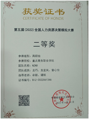 【文/牟聪】为深入落实学院“专赛融通、以赛促教”的专业建设要求,商务管理专业实施“开展实践育人,加强专业技能教育,促进人才成长,推动实践教学改革,提高人才培养质量”的专业建设方案, 积极组织学生参加由中国管理现代化研究会主办的“第五届(2022)全国人力资源决策模拟大赛”。