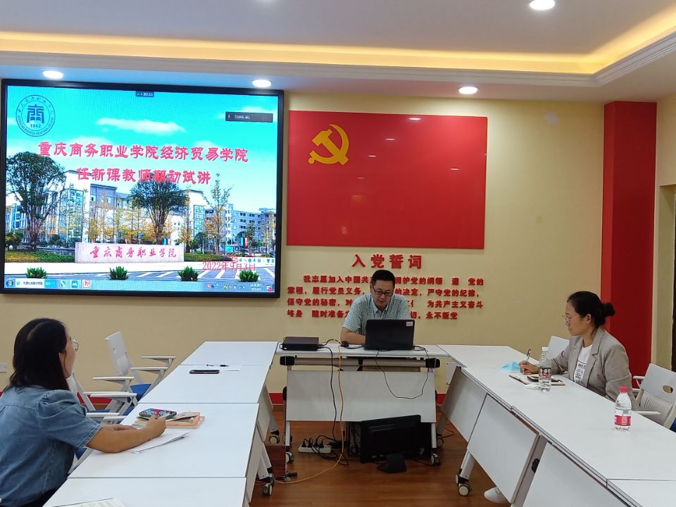 【文/图张露莎】为加强教师教学能力培养,帮助任新课教师高质量地完成教学任务,经济贸易学院于2022年9月3日下午召开“新任课教师期初试讲”活动。本次活动由副院长王芳在第一教学楼1301主持,教学办公室主任刘豪等行政人员现场参加,4名教师远程线上试讲、1名教师现场模拟线上授课。