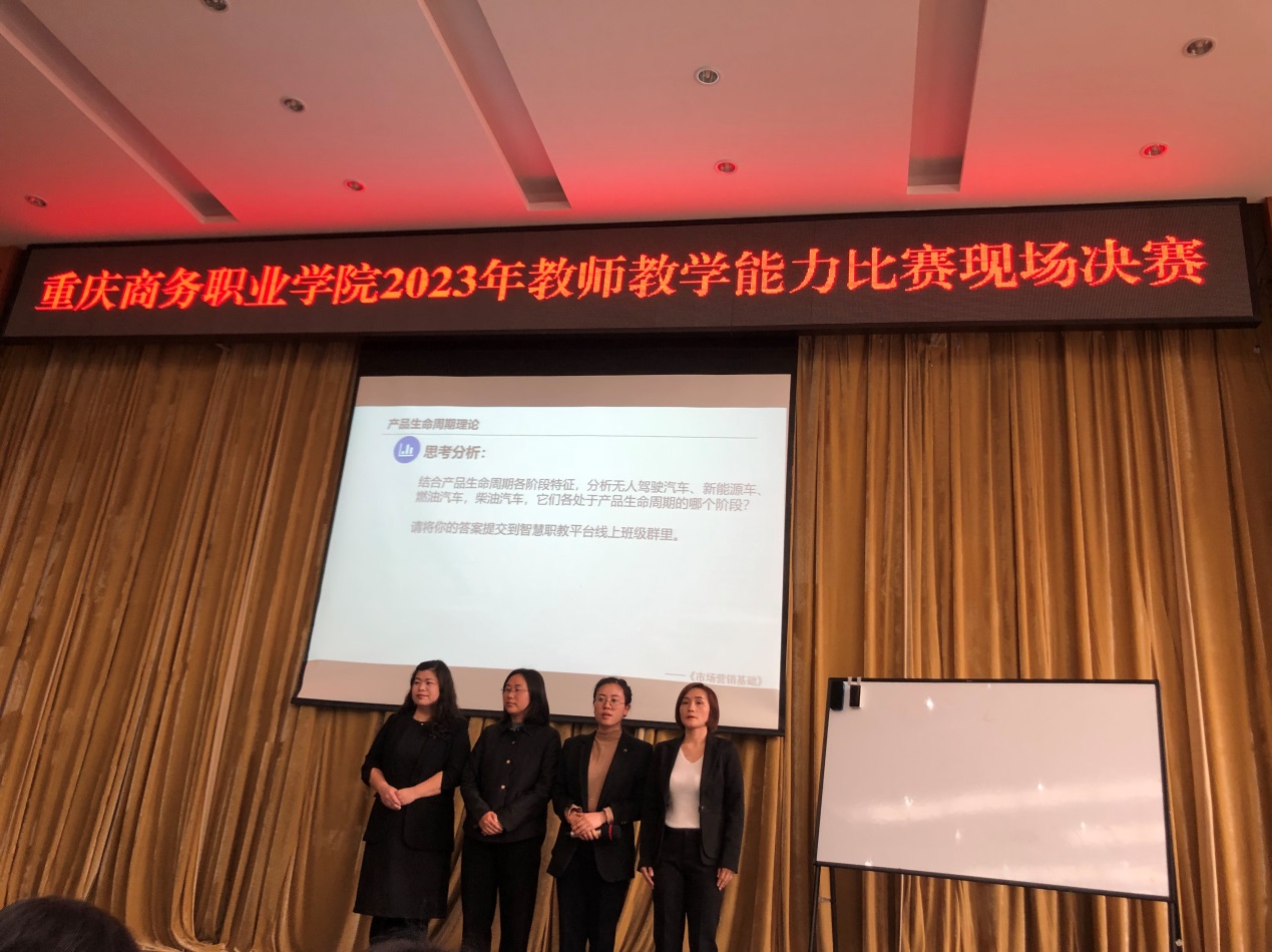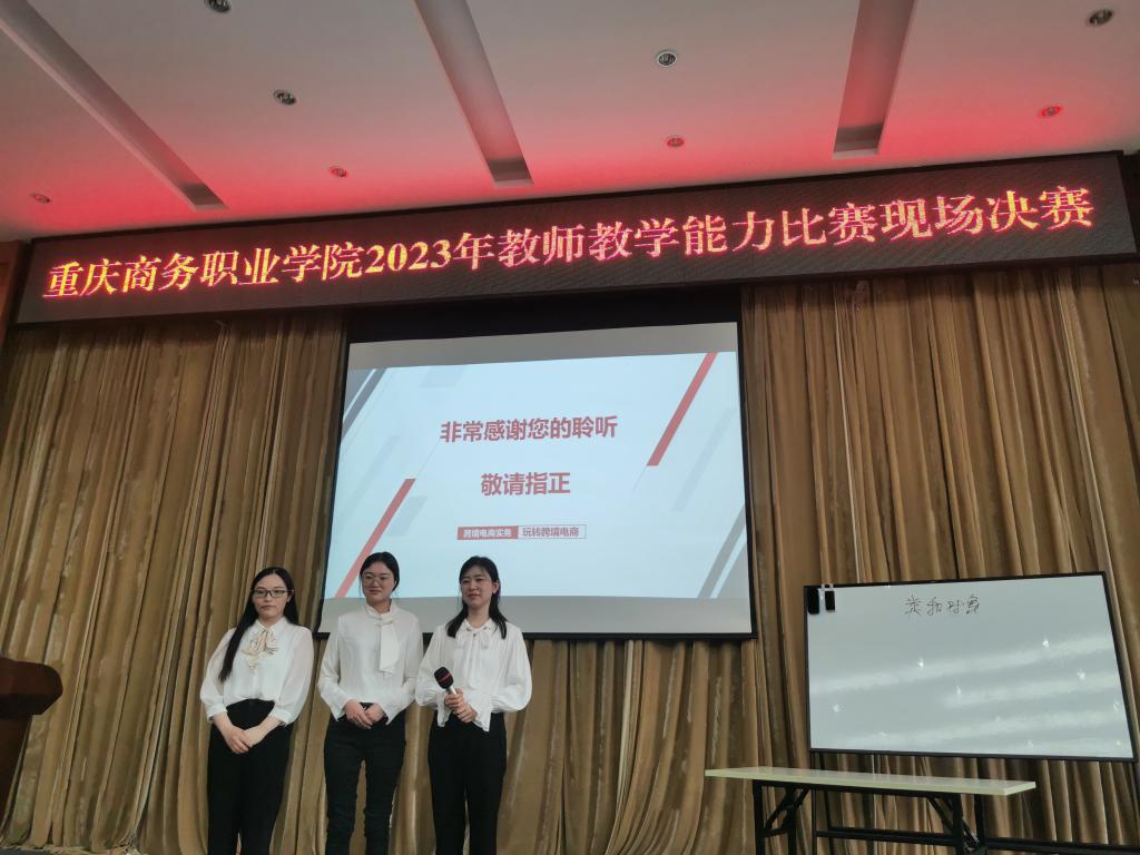 【文/图 王芳】为积极落实国家人才强国战略,促进学校教师教学能力和信息技术素养的全面提升,2023年3月22日下午,重庆商务职业学院2023年教师教学能力比赛决赛在一会议室拉开帷幕。本次比赛一共有来自全校10个二级学院共计14支队伍参加比赛,经过激烈角逐,我院由周双燕、桂郭芝子、杨洋、崔静4位教师组建的《跨境电商实务》教学团队以第三名的成绩获得二等奖,并将代表学校参加市赛;由杜玲、黄晏、谭娅、梁礼丹4位老师组建的《市场营销基础》教学团队获得三等奖。