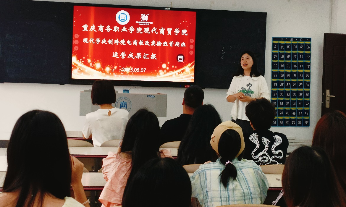 【文/图 何楠】为深化产教融合,培养适应行业发展的高素质跨境电商人才,5月7日,现代商贸学院与中新(重庆)跨境电商产业园联合举办的跨境电商教改实验班举行阶段性成果汇报会。中新(重庆)跨境电商产业园总经理王利刚、现代商贸学院副院长王芳、企业导师、校内指导教师及36名参训学生共同参与。